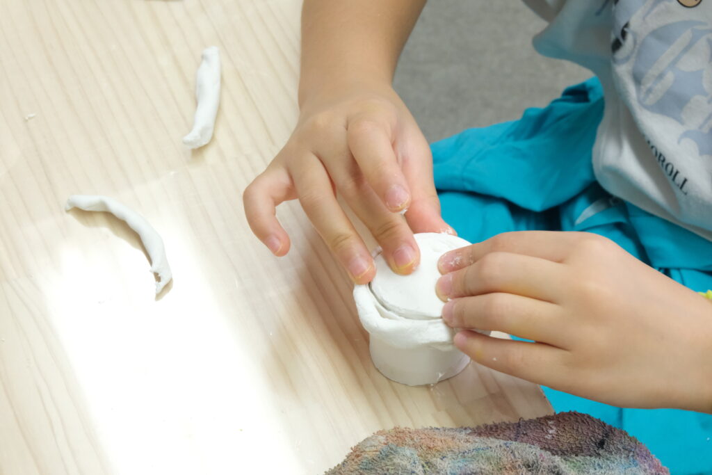 トイレットペーパーの芯と粘土で植木鉢を作っています。小さなサボテンの盆栽に、大きな創造力が詰まった作品です。完成が楽しみです!頑張ってね。