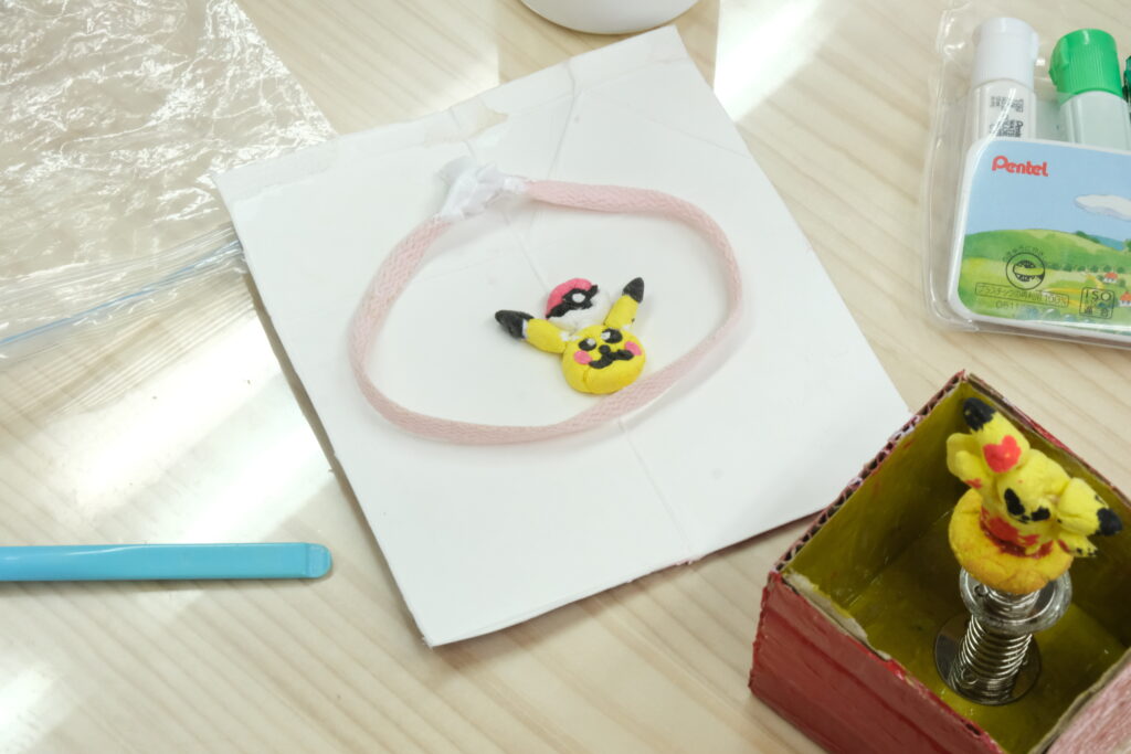 ポケモン好きにはたまらない作品です!!箱の蓋をとめるための紐の飾りもピカチュウですね。モンスターボールも上手!手にとって楽しんで欲しい作品です。