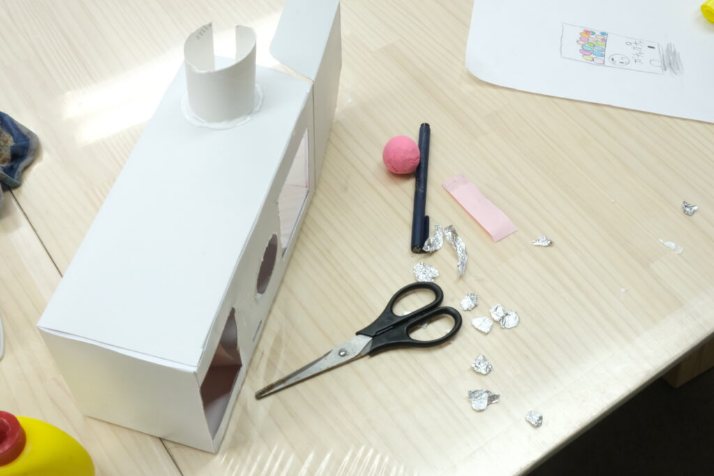本体の形が完成しました! アルミホイルでコインを一生懸命作っています。 粘土でカラフルなボールも制作中! どんな色のボールがガチャガチャから出てくるのか、まるで本物のガチャガチャを回すときのようなドキドキ感が味わえますね。