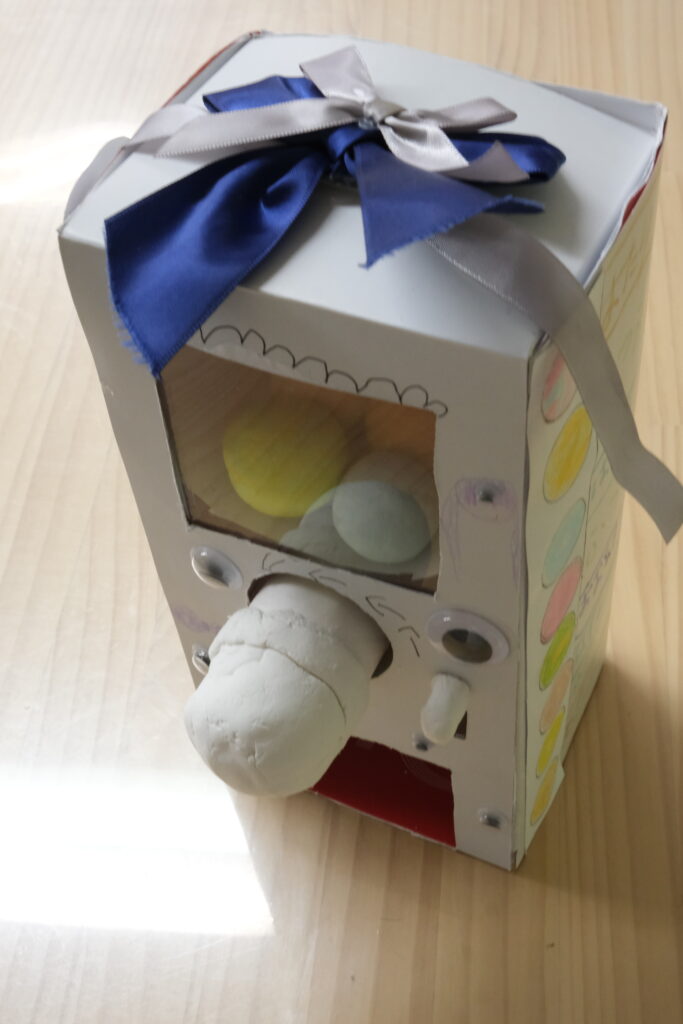 手に付けて、手の動きで、口が開くように工夫されていて、とてもユニークな作品ですね。見た目はシンプルだけど、試行錯誤を重ねて、とても難しい工作だったと思います。本当によくがんばりました。