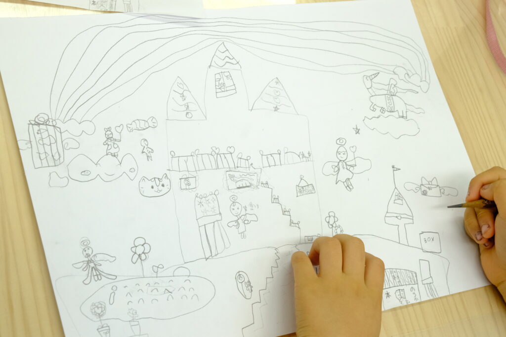 ユニコーンや天使たちが住む夢の世界!空に広がる虹のデザインが印象的です!豊かな想像力と丁寧な描写に、とても感心しました。お城にはどんな物があるのか、もっとしりたくなりますね!着彩も楽しみです!