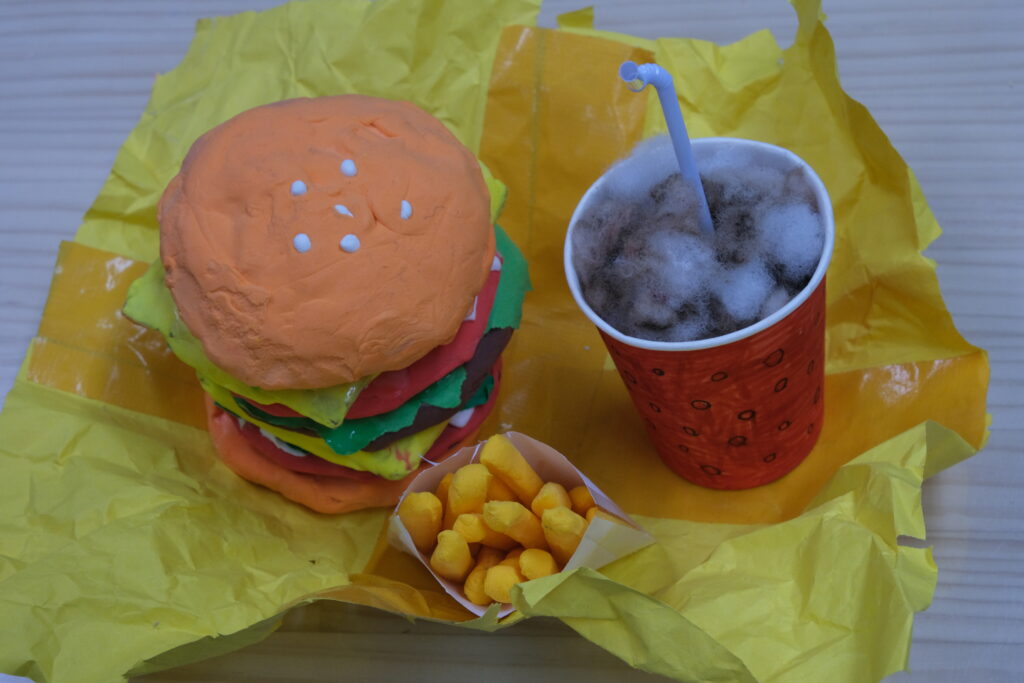 まるで本物みたいなハンバーガーセットが登場しました!!大きなハンバーガー、とっても美味しそう。ポテトの形も丁寧で、コーラもごくごく飲めそうです!