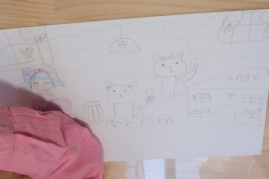 猫ちゃんと飼い主の女の子を描きました。部屋の中の物もたくさん描かれていて、素敵ですね!!