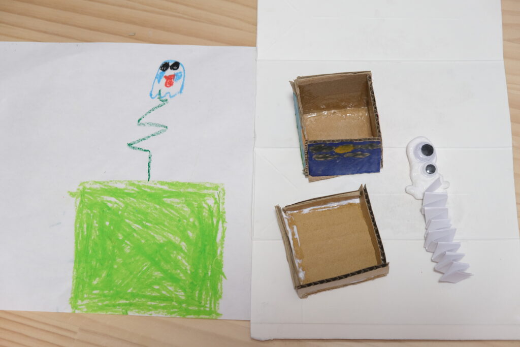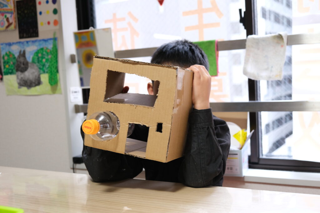ダンボール組み立て、順調ですね!完成形が見えてきましたが、内部の仕組みがうまく機能するよう、さらに工夫が必要ですね。諦めずに頑張ってください!