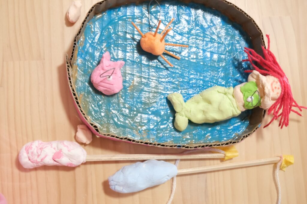 釣竿を作って、完成です✨人魚がとても可愛いですね。髪の毛はアリエルと同じ赤にしました。