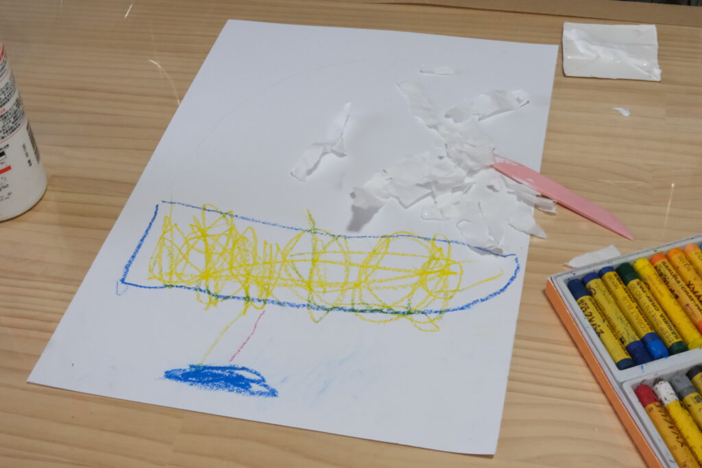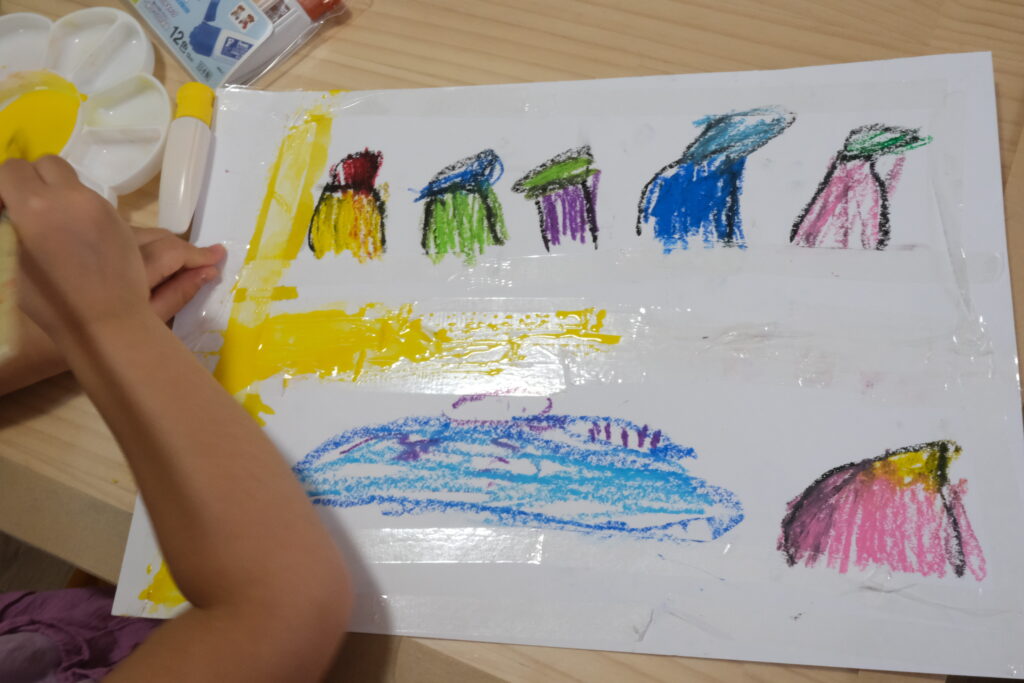 セロハンテープで道を作り、建物をいっぱい描きました!