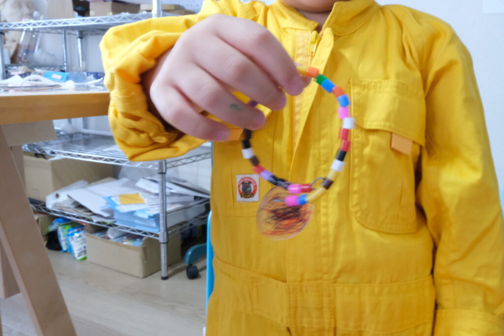針金にアイロンビーズを通して、プラ板で飾って、素敵なブレスレットの出来上がり!