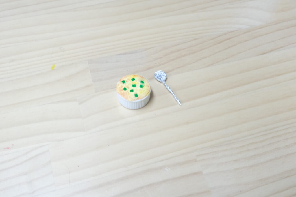 ペットボトルのキャップを使ったミニチュアのグラタンが完成しました!小さな器にぎゅっと詰め込まれた美味しそうなグラタン、焼き目がとてもリアル!思わずたべたくらるようクオリティ!!