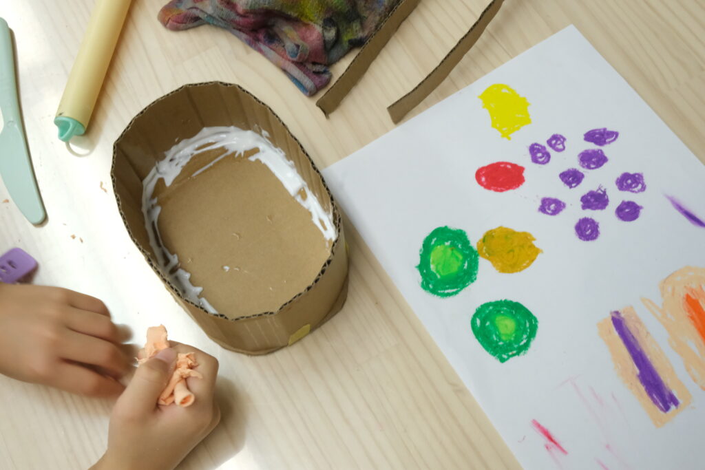 ダンボールでお弁当箱を作り、粘土でサンドイッチを作成中です!一生懸命に形や色にこだわり、リアルなお弁当を再現しようと頑張っていますね!素晴らしいです!